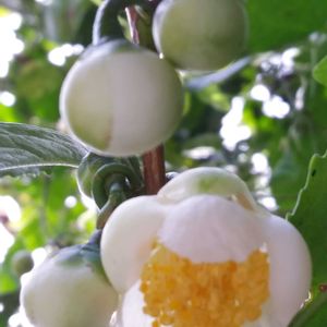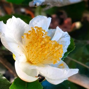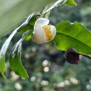 ツバキの仲間で 花期は晩秋🍂 白い5弁花の花がほぼ下向きに 咲きます🎶 (径2~3cm) 多数の雄蕊が突き出し微香あり ✳️散る時は 花弁がバラバラに ならず この花のまま落下する✳️ 茶の木 ツバキ科