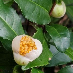 おはようございます🙋☔️ 実家の片隅で見つけたチャノキ🍃 花が咲いて見つけました🤩 葉を摘んでレンチンして見ようかな😃🎵