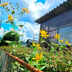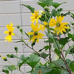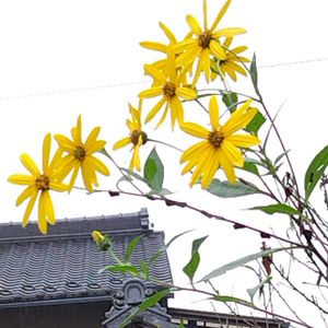 ☆庭のお花達☆ キクイモの花のようです 昨年、花が終わった頃 枯れた長い茎に根っこが ついたのを頂き、小さな お花のひまわり🌻だと思い、 南の隅っこに茎を短く✂️し、 植えてみました〜 夏に茎2本、長く伸び、 下葉が枯れていて、 お花を諦めていたら、 今漸く咲きました〜 水不足だったのかもですね? ググってみたら、キクイモとか 食べれるらしいけど🤔 これは畑に植える物ですねー 私はお花だけ生け花で 楽しみます〜