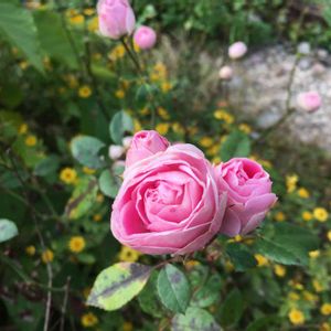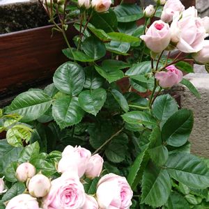 薔薇アンジェラ、ポツポツとまた咲いています🌹 よく見ると、新芽に虫がいっぱい😱 下は、初登場の『花ぐるま』🌹 春にお迎えして蕾も沢山出来たのに、何故か咲かないままに💦 やっと3番花で小さな可愛いお花を咲かせてくれました🎶