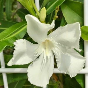 満開の白いキョウチクトウと道路を挟んで赤いキョウチクトウも咲いていました❣️ こちらは背の高い1本だけだったので、下の方に咲いていた花を📷️