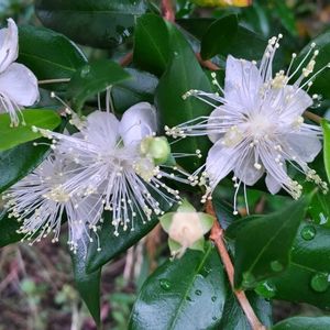 ポツポツ雨が降る中、大きな木の下で咲いている白い花。 AIがギンバイカと教えてくれました。 西洋キンシバイに似ていますが、大きさはその半分以下の小さい花です。 素敵な白い花です❣️