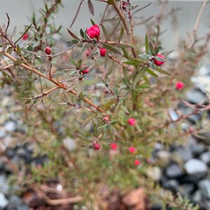 ギョリュウバイ(レプトスペルマム)🌸 いつもご近所さんのお宅に大きいのが植っていて気になっていた子が、Green Farmさんにお手頃サイズで並んでいたのでお持ち帰りしてきました😆 ギョリュウバイ(魚竜梅)と書いてあったので日本のお花かと思っていましたが、ニュージーランドやオーストラリアが原産だそう🙄 和名で梅と名付けられたのは、お花が梅の花に似ているからとのことでした😄 お花は小さくて可愛いのに、このくっきりとした深い赤色がとてもかっこよくキレイでついつい見入ってしまいます😍 色違いでピンクもありましたが、赤好きとしてはこっちでしょ!と独り言をぶつぶつ言いながら選びました🤣 まだまだ蕾もたくさんあるのでたっぷり楽しみます🌸✨✨