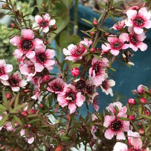 ギョリュウバイ(レプトスペルマム)が秋口からずっと咲いています✨。 花のピークはもう少し暖かくなってからです。