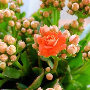 もうひとつのカランコエ(クイーン・ローズ)😊 こちらは濃いオレンジ色で花半分、蕾半分位です。葉っぱも蕾も蜜ですね😅 ピンク色も可愛い💕オレンジ色も華やかですね😊