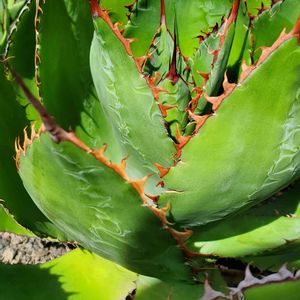 こちらは、アガベ ボビコルヌタ「カウズ・ホーン」 Agave bovicornuta Cows Horn・ 緑の葉に赤茶色のナギが渋い株です。