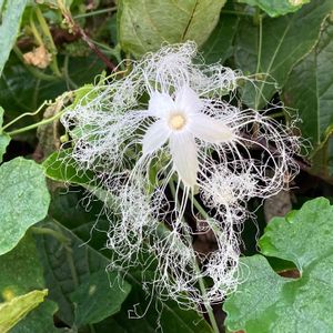 カラスウリ 𓂃𓂂𖡼.𖤣𖥧𓈒◌܀𖥧𖧧 ˒˒. 先日のカラスウリのお花をみつけました‼️ 今朝は綺麗に開花していました✌😄 花弁の周りは細い糸の様なのがクネクネして…珍しい花弁 ガなどを呼ぶのね…😱