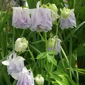 オダマキ♡ 電停横の花壇に咲いています🚉 初めて見る花の形と優しい色合いです♪ 茂みの中にひっそりと咲いていました。
