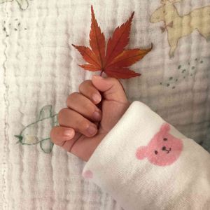 晴れ☀︎の日が続き お散歩をしながら近所の紅葉を 楽しんでいます♪ 拾ってきた落ち葉を お昼寝中のおてて✊にそっと…🍁 寝返りをするようになって 目が離せません|ω・`)じーっ
