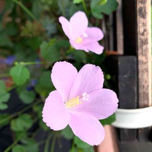ベランダの夏のレギュラー、ハイビスカスロバツスさん、 今朝は5輪開きました🌸💕 優しいピンクの一日花です😌