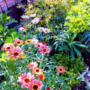 一瞬の晴れ間☀に📷😆 ちゃんとハンギングした〰〰! ・フェリシアスプリングメルヘン ・ゼラニウムカリエンテ ※葉っぱが紅葉中でも蕾が上がってきてます この場所は駐車場のウッドフェンス まだまだ開拓途中なので全貌を撮るのはちょっと💦な場所ですが朝は日が当たるので陽射しを求めて移動したりしてます。