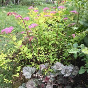 ヒューケラとシモツケ この庭の脇役たちも花が咲くと 葉の美しさと共に引き立って見えるね✨