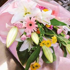 こんにちは はなのみせ花紋 嫁です🐱 9月に入り急に秋!雨の9月始まりとなりました。 今日は長袖がいいくらいの気温でビックリですね😅 退職される方へのプレゼントという事で花束のご注文いただきました💐 ピンクのユリをご指定いただいて明るくとのことで、黄色の姫ヒマワリや鮮やかなピンクのガーベラなどを合わせて束ねました。 花束の作り方も様々、YouTubeなど見たりすると世の中フローリストさんがたくさんいて。試行錯誤してるんだなと、勉強になります👍️ 多肉もいいけれど。いけない!私花屋だった💦とハサミをにぎり直す嫁でありました☺️