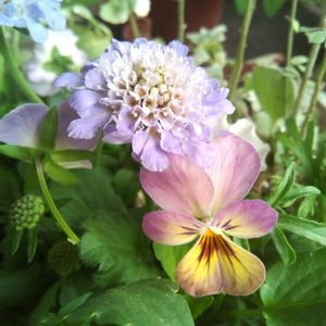 夏に、日差しに強い白いお花たちを植えていた レンガ調のコンテナに、 この冬は、 サントリーフラワーズのビオラ、 フィオリーナ の、 スカイブルーとオーロラを3株ずつ交互に🌸 冬に植えるならきつめに寄せ合ったほうが 良いって、何かに書いてあった😊 花柄摘みがんばるから、 たくさんのお花咲かせてね🤗