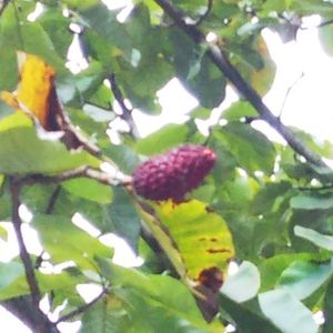 いつも行く木の公園で… 一瞬❗ 果物の王様ドリアン😲 確か…朴ノ木 素敵な花💠が咲いてたのを撮ってました。 見た目…真っ赤12cmトゲトゲ😓 此れからどーなるか見守ります。