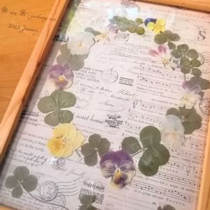 押し花リース🌼できました💗 去年 庭や公園🐾で見つけた 四つ葉&五つ葉のクローバー🍀*゜ ビオラさんと一緒に📖に挟んでいたのが出てきたので、フレームにまとめてみました♪ 昔は分厚いタウンページで作るのが定番でしたが🍁🍂、最近はティッシュでサンドしてから "犬猫の家庭の医学📖" に入れています🐕🐈🐈 (病気調べる時ちょっとじゃまですが、厚さと重さが手頃で^^;💦) 今年はどんなお花でつくろうか、春が楽しみです☺️🌸 .°ஐ.*
