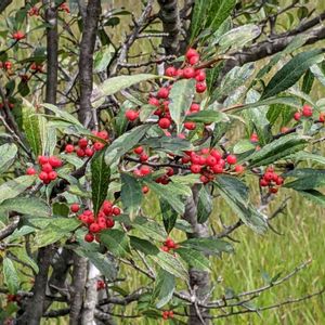 ミヤマウメモドキ(深山梅擬) モチノキ科 葉がウモモドキより細くて、葉先が尖っている。 赤い実が、鮮やかで見事です。 黒野田湿原にて
