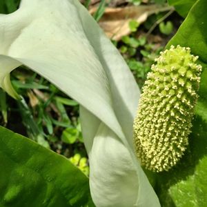まだ春の初めだと聞いたので、淡い期待を抱いて訪れたいもり池。 まだ咲いていたミズバショウです❣️ 白い花弁のようなものは苞で、葉っぱの変化したもの。 真ん中の棒のようなものは小さな花の集まりの花序。 ツブツブの1つ1つが小花で4本の雄しべと1本の雌しべがあるそうですが、そこまでは撮れませんでした😵💫