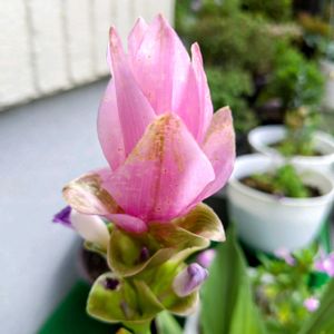 おはようございます😊 クルクマのお花が咲きました。球根5個植えたけど、今のところひとつしかお花が咲いてません😞これから咲いてくれます様に🤲