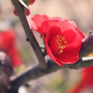 ボケが満開。③ 春の陽射しに透き通る花びら。