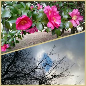 今日の🐶散歩🚶 寒空に山茶花。 山茶花は葉がつやつやで、「まだまだこれからよ💗」と、言っているようでした。
