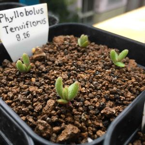 フィロボルス テヌイフロルス 鉢がパンパンだったので植え替えました。 小さい大根って感じです! 実生7ヶ月になります。