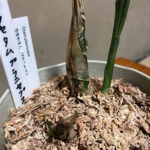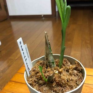 ☆発芽☆ 7月、階段に落として根先の全てが木っ端微塵になったカタセタム達。師匠のアドバイスにより株分けしたタケノコから芽が出てまいりました✨ 株も根付いてホッと一息。 残念ながら、シクノデスの方は仮植えの底穴が小さく過湿になってしまったのが原因で枯れてしまいました。 カタセタムさんご免なさい。