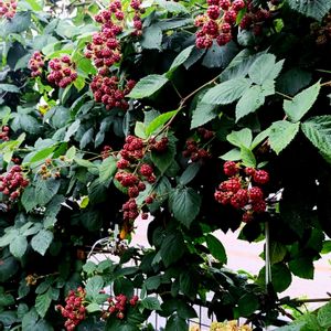 【 ブラックベリー 】 赤い実🫒がもう少し ブラックに色づいたら 収穫楽しみです✨ 1️⃣ブラックベリー 2️⃣アガパンサス 3️⃣ミニトマト🍅 4️⃣茄子🍆🍅 5️⃣青紫蘇 ミョウガ 薬味に重宝してます