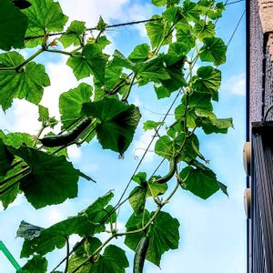 【 キュウリ🥒 】 伸ばせばどこまでも 最近は猛暑で無理ですね 4枚目は今朝のキュウリ 🌧️雨が少し降ってくれたので、イキイキ🥒キュウリ収穫できます✨
