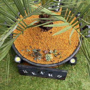 明日から天気が悪そうなので、慌ててもう一つ穴掘ってココスヤシを植え替えしました! 大きな鉢に合わせて人工芝と防草シートをカッターでくりぬき、それに合わせてひたすら掘り掘り💦 少し高さを出して植え替え。いつも枯らしがちな多肉ちゃんも一緒に植え替えてみました😊 ソーラーライトも付けて夜もライトアップで楽しめるかな✨