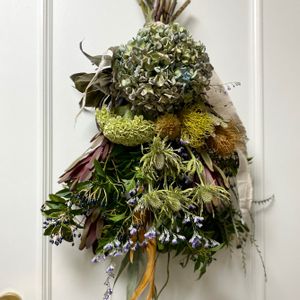 秋色スワッグ♥︎︎∗︎*゚ アンティーク色が素敵な紫陽花「マジカルクリムゾングリーンブラウン」がメイン。 ヒマワリ「ゴッホ」も可愛く乾いてくれました。 ナンバン、ビバーナムコンパクタベリーを入れてコニファーブルーバードでボリュームを出しグレビレアゴールドで秋色に纏めてみました。 ふわっとスモークグラスが好きなポイントです♫