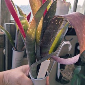 以前ビルベルギアを育ててたけど、冬に多忙で放置してダメにしてしまいました。 ネオレゲリア以外のタンクブロメリアは地元の店舗で見かけることがほとんど無いから、もう育てる事はないかもと思ってたけど、ホームセンターでアモエナとテキーラサンセット見つけました。しかもそんなに高くない。即GET✨ 店内に長く置かれてたのか、色が良くないし、のびのびと徒長してる感じがするから、ベランダでガンガン日向に当ててあげなければ✨✨