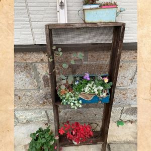 昔々のお話😊 大きな金網が貼ってある枠? を見つけました。 多分、昔土を振るったフルイだと思います。 何か,利用したいと思いつつ、 立て掛けてみた😅 最初枠だけで上下に植物置いてましたが, 真ん中にも棚を作ってみた。 まあまあ、いいんじゃない💕 真ん中には, 昔々の旦那が捨てた工具箱🧰 を拾って植物寄せ植えしちゃいました🪴 1番下のヘンリーツタが真っ赤に紅葉してます🍁 旦那には 水入れてるすぐサビでボロボロになるよ,と言われましたが, どうせ捨てようとしたもの、 もう一度花咲かせました🤗 まだまだ花が少ないので ちょっと地味めです😅 🌼🌸🪴💕
