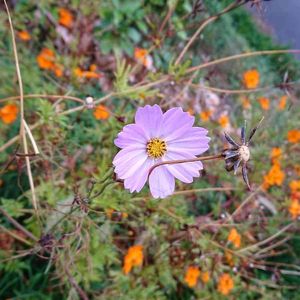 近所の空地にばらまいたコスモス 風に倒され膝丈位になってしまった。