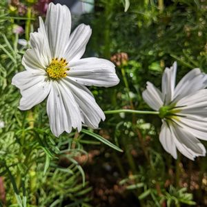 お庭の花達です ギボウシまた咲いてます🤍 零れ種からのコスモス 彩とりどりに咲いてます🩷🤍🩷🤍❇️ 葉っぱが素敵な黒葉ダリアです✳️❤️ 🏷️白い貴婦人✨