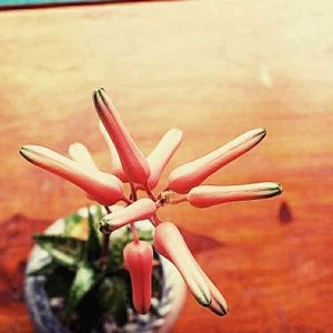 息子が一人で寝てしまったのでシャワーを浴びてふんふん(。-_-。)♪しながらGS見ててふっと見たら…咲いてた!! 気づくの遅かったな~(^_^;) アロエジュクンダのお花です♪ つりがねでちょっとも開かないから気付きにくいのよ…(^_^;) オレンジ…いやサーモンピンク? 出産の時に一緒に実家に里帰りしてそのまま3年置きっぱにしてたら春秋毎回咲いて、カットして連れ帰ったらまた咲くと…花鑑賞用の植物より咲いてるね(笑)