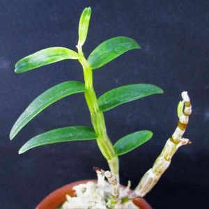 セッコク 黄縞、燕尾、管葉 高知県尾川産 このセッコクは黄色の縞斑が入り、葉の先がふぞろいでギザギザ(燕尾)になります😆芸が進むと右上の葉のように葉が管のようにくっついて伸びます(管葉)😄 おそらく花も変わった花が咲くのではと期待です✨💕