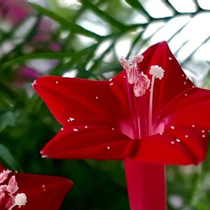 蕊が綺麗です! ルコウソウの蕊が 綺麗に撮れました ヒルガオ科ですが 早朝 5時過ぎには開いていました 蕊も開き 花粉が飛びやすいので 花弁の上に飛んでいます