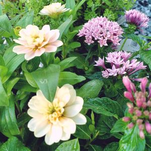 百日草さんと ペンタスさん 優しく微笑んでいるみたいで 癒されます 🤍🩷(*ˊᵕˋ*)🩷🤍