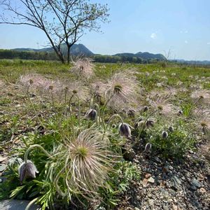 オキナグサ キンポウゲ科 オキナグサの群生地に行ってきました🎶 ムラサキ色の下を向いたお花から、大変身です! これからまた、綿毛になるそうです。 白く長く綿毛のある果実の集まった姿を老人の頭に例えオキナグサ(翁草)というそうです。