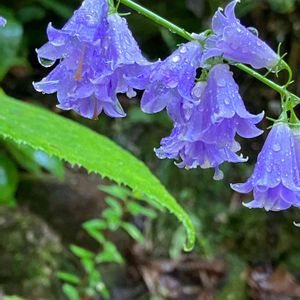 雨上がりの朝、倒れてしまったツリガネニンジンの花がガラス細工のようできれい〜💜