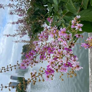 週末のバンコク、ベンジャキッティ公園の池をバックに咲くお花。ハギみたい?