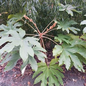 今日のお花 ヤツデの仲間です 紙八手 カミヤツデ ウコギ科 カミヤツデ属 中国、台湾原産 花11~12月 高さ2~6m 幹の髄から造花などの材料の通草紙が作られる ヤツデと比べて葉も大きく高さもあって南国の雰囲気です 蕾がたくさんついていました 小さな株が近くにあり撮影できました 11月24日