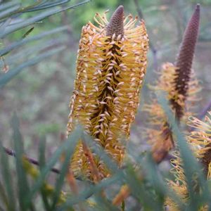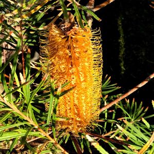 台風20号から離れてるのに、なかなかの暴風雨でした。 晴れ間がさして、ゴールド感出てきたバンクシア。