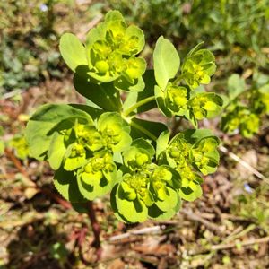 トウダイグサ トウダイグサ科 枝垂れ桜🌸の樹の下には、 茎の先に大きめの葉が5枚輪生し、更に茎を伸ばし黄緑色の花(雄しべだけになった雄花、丸く見えるのは雌花とか)、が咲いてました。 草丈15〜20センチのトウダイグサが陽ざしがさす南方向を向き、ずら~り並ぶ姿が見られます
