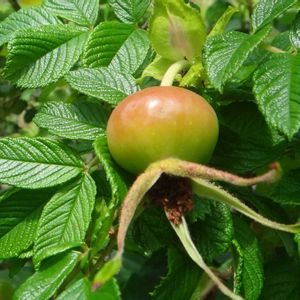 ハマナス(浜茄子) バラ科バラ属 落葉低木 秋になると、花が咲いた後に「ローズヒップ」と呼ばれる赤い果実を実らせます。 見た目はミニトマトのような丸い形で、緑からオレンジ、赤へと熟していく色の変化が楽しめる。 海岸の砂地ではないので植栽された物だと思います。 6月16日 場所:愛知県 鳳来寺山参道