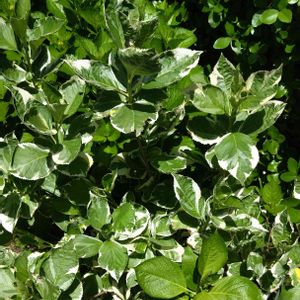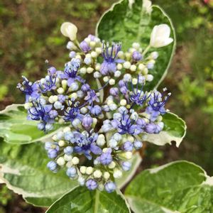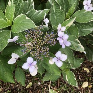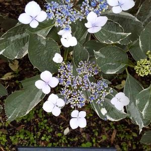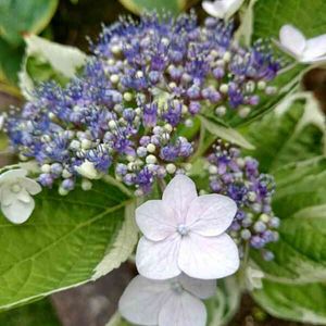 学名:フイリガクアジサイ 葉に白い斑が入るのが特徴。 たくさんあるあじさいの中で、 2m程あるその株だけ、葉が全て縁取りされていました! アイビーに花が咲いたようなゴージャスなあじさいでした🌿