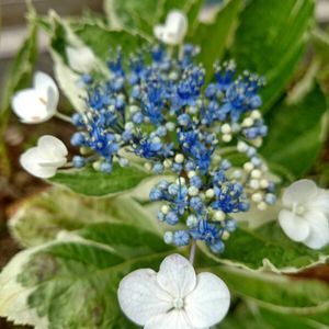 そろそろ梅雨入りするのでしょうか… 今にも泣きそうな… 斑入り額紫陽花🐌💞 挿し木から かれこれ20年近くになりますが、今年も咲き始めました~💙
