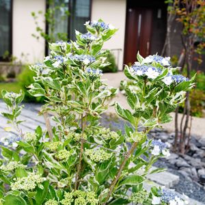 朝の散歩で大変綺麗にお庭を手入れされているお家があり,フイリガクアジサイが綺麗でした。園芸種と思いますが,こんなのもあるんですね。