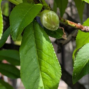 枝垂れさせていない枝垂れ梅に、気が付いたら二つだけ実が生ってた😳 いや、花が咲けば実は生るんだろうけど、食用じゃないのに、と少しびっくりした😅